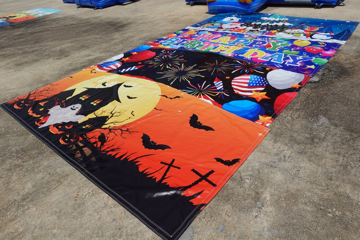 This versatile commercial-grade inflatable bounce house comes ready to adapt to any holiday or celebration with five interchangeable art panels: Halloween, Christmas, Fourth of July, Easter, and Happy Birthday. Swap panels in minutes to keep your bookings fresh and seasonal all year long.