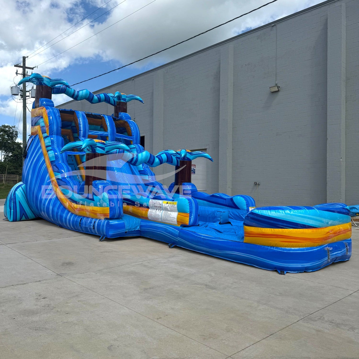 Experience the thrill with BounceWave's 18ft Flashpoint Falls Hybrid Dual Lane Inflatable Water Slide! This cutting-edge commercial-grade inflatable features: