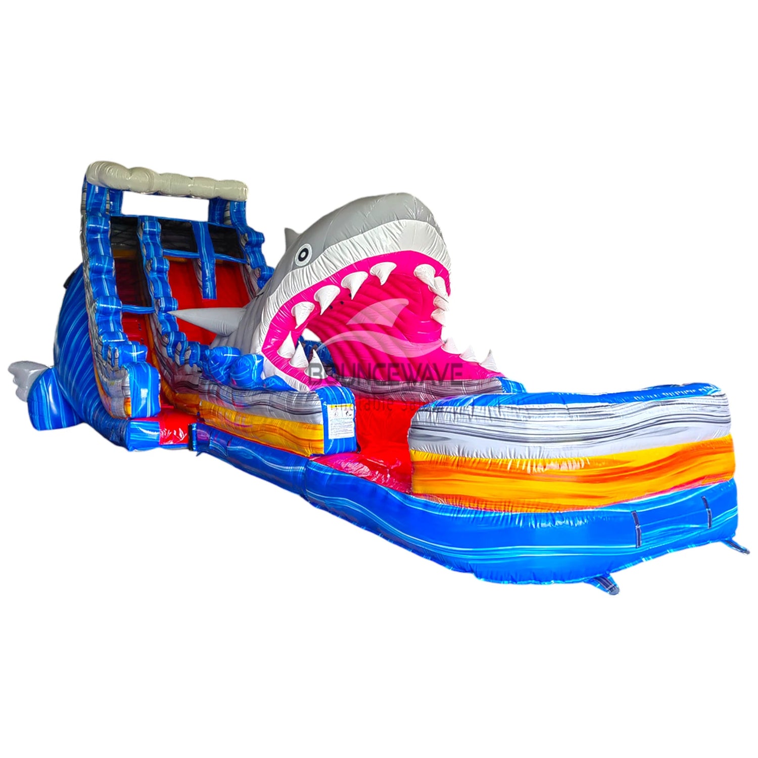 Customizable heights are available with this inflatable water slide. Call (888) 901-9283 for pricing and options. Create unforgettable shark-themed adventures!