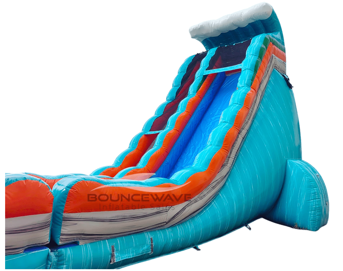 Elevate your rental lineup with the 24ft Fiji Palms Single Lane 2-Piece Water Slide with Slip & Slide — an operator-friendly, revenue-driving design built for serious rental pros. This vibrant tropical slide showcases teal, gray, and bright orange marble vinyl with bent palm trees at the top for an unmistakable island vibe renters love.