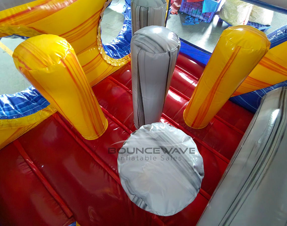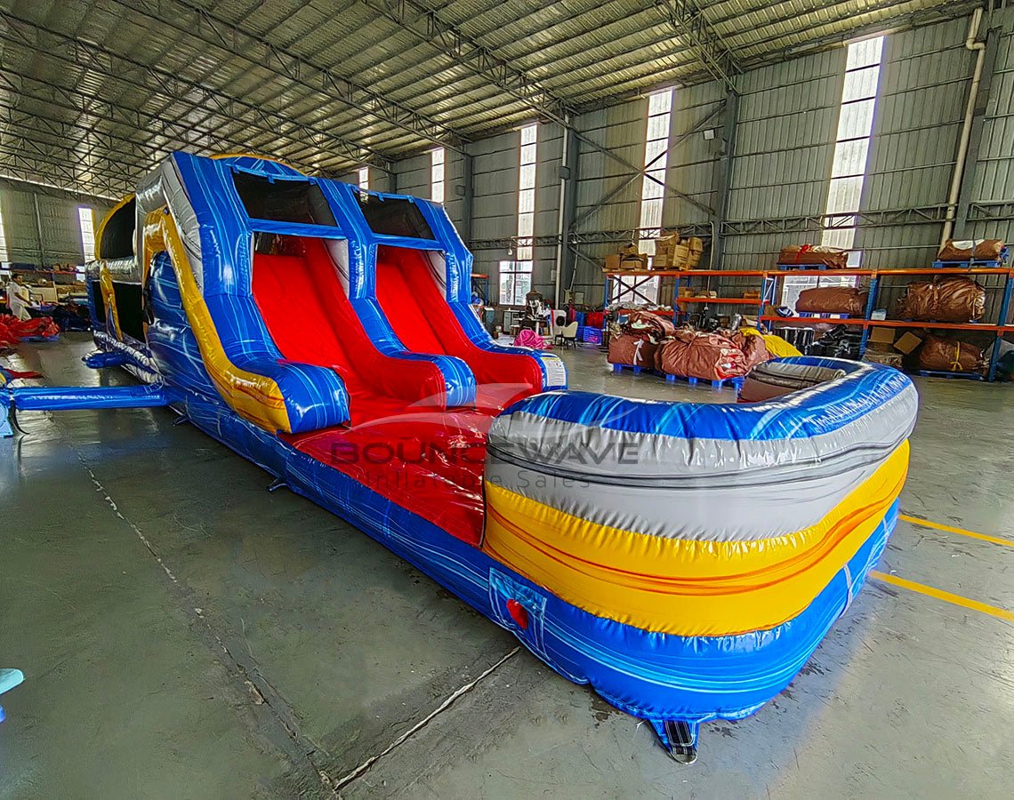 Ride the wave of bookings with BounceWave’s 46ft Rip Curl Hybrid Wet/Dry Inflatable Obstacle Course — Commercial-Grade! This stunning Obstacle Course features a bold blue marble, yellow marble, and gray marble color scheme accented with vibrant red slide liners for a show-stopping look that pops at any event. Its compact yet impactful 46-foot length delivers the thrills of a larger course while staying easy to transport, set up, and tear down — ideal for rental operators who value quick turnarounds and fast ROI.