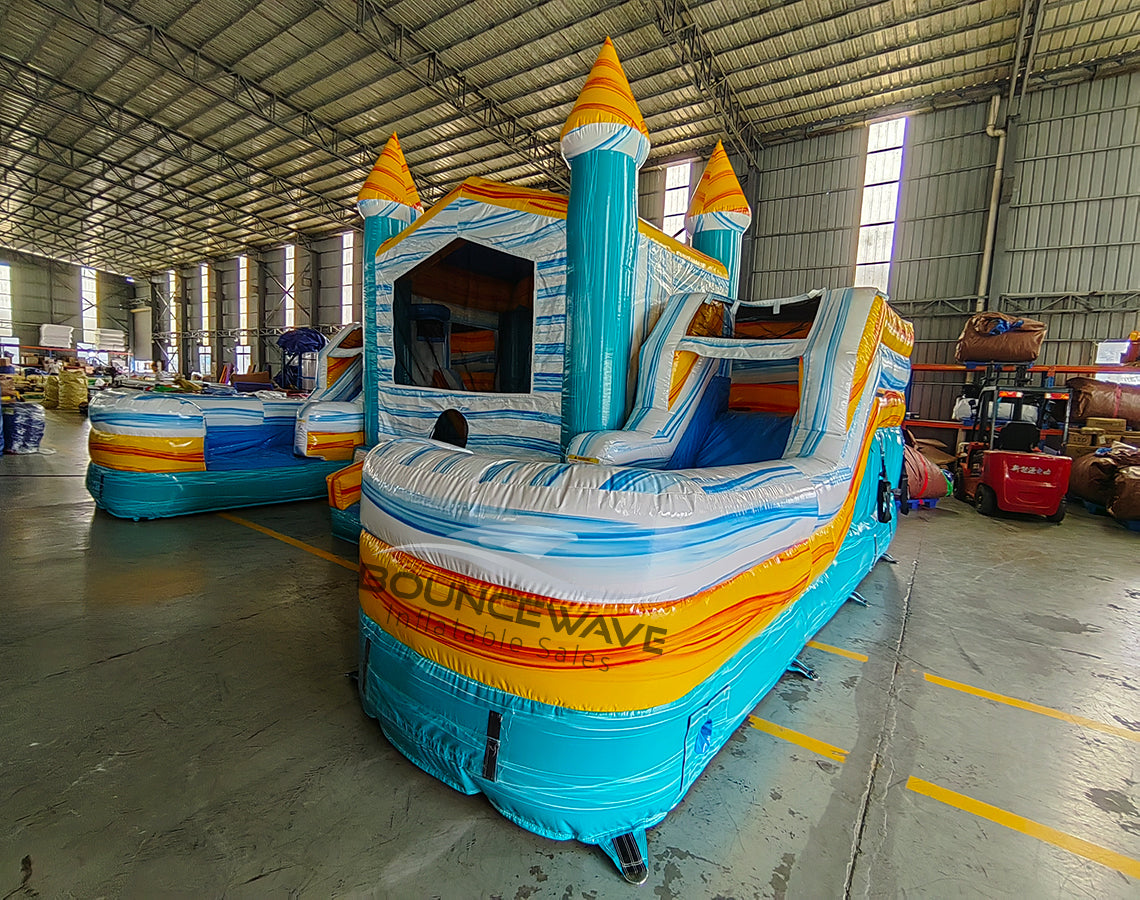 Bring laid-back beach vibes and serious rental performance to your lineup with the Surf’s Up Econo Duo Bounce & Slide Combo (Wet/Dry) from BounceWave. Featuring a vibrant blend of cloud marble, teal marble, and yellow marble, this eye-catching combo delivers broad age appeal, strong visual presence, and reliable year-round booking potential — all in a compact, operator-friendly footprint.